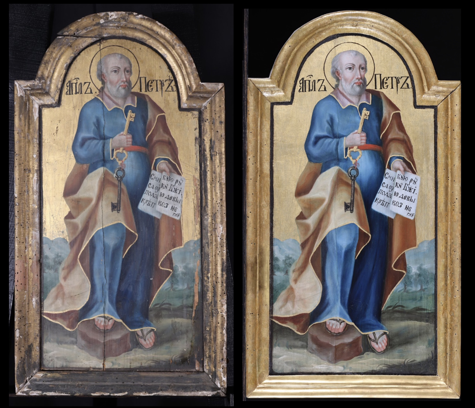 Simon Pétert, a betszaidai halászt az Úr maga jelölte meg Kéfás (szikla) névvel: „Te Péter vagy, és én erre a kősziklára fogom építeni egyházamat, s az alvilág kapui nem vesznek erőt rajta. Neked adom a mennyek országának kulcsait. Amit megkötsz a földön, meg lesz kötve a mennyekben is, és amit feloldasz a földön, föl lesz oldva a mennyekben is.” (Mt 16,18-19) Az ősz szakállú apostolfejedelem, Krisztus nyájának pásztora jobb lábát egy kövön nyugtatja, jobb kezében kulcsait, baljában apostoli levelét tartja, melyen a következő idézet olvasható egyházi szláv nyelven: “Alázkodjatok meg tehát Isten hatalmas keze alatt, hogy felmagasztaljon titeket annak idején.” (1Pét 5,6)