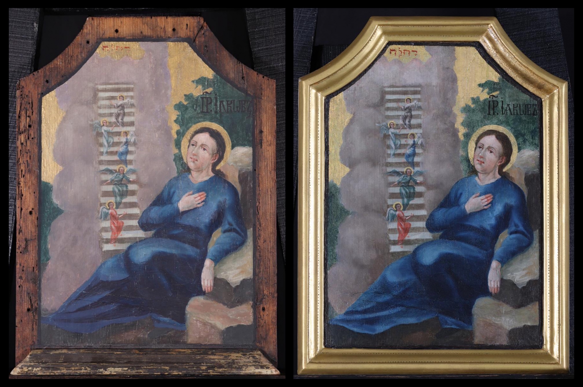 Az ifjú, szakáll nélküli Jákob, Izrael 12 törzsének ősatyja egy kőnek támaszkodva ül a földön, jobbját szívére helyezi. Születésekor ikertestvére, Ézsau sarkába kapaszkodott, kitől aztán csellel szerezte meg az elsőszülöttség jogát, majd az atyai áldást. Miután elmenekült testvére haragja elől, álmában égig érő létrát látott, melyen Isten angyalai jártak föl és alá. Az ikonfestő lépcsőn ábrázolta az öt angyalt, kik Jákobra tekintenek a magas felhőoszlopból. A lépcső felett Isten kinyilatkoztatott neve, JHVH (kiejtve Jahve) olvasható héber nyelven. Az Úr így szólt Jákobhoz álmában: “Én vagyok az Úr, atyádnak, Ábrahámnak Istene és Izsáknak Istene! A földet, amelyen alszol, neked és utódodnak fogom adni. Annyi utódod lesz, mint a föld porszeme. Kiterjedsz nyugatra és keletre, északra és délre. Benned és utódodban nyer áldást a föld minden nemzetsége. Íme, én veled leszek, és őrződ leszek, bárhová mégy, és visszahozlak erre a földre. Nem hagylak el, amíg nem teljesítem mindazt, amit mondtam! (Ter 28,13-15). Jákob a feje alá tett követ másnap emlékkőnek állította fel, s fogadalmat tett: “Ha velem lesz az Úr, és megőriz az úton, amelyen járok, ha ad nekem kenyeret, amit megeszem, és ruhát, amit felveszek, s ha szerencsésen visszatérek atyám házába: az Úr lesz az én Istenem.” (Ter 28,20-21)