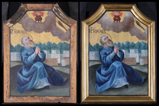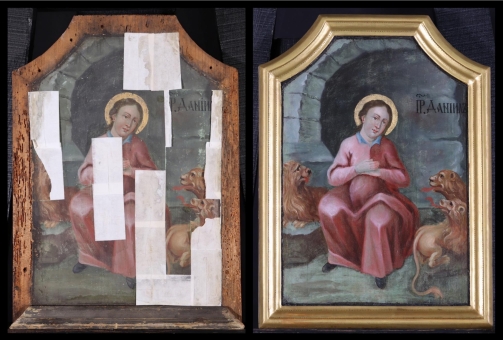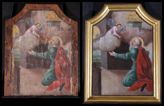 Az ikonosztáz királyi ajtajának restaurálása. A restaurált ikonok bemutatása a műhelyben 2019. október 10-én. A restaurálás helyszíne az "Árpádházi Szent Erzsébet Szeretetotthona" volt. (Budapest, Szerb Antal utca 13.)