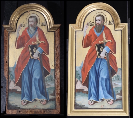 Szent Máté, az első Evangélium szerzője, kafarnaumi vámszedő volt, mielőtt Jézus tanítványává szegődött. Házában mondta Jézus az ítélkező farizeusoknak: ”Nem az egészségeseknek kell az orvos, hanem a betegeknek. Menjetek és tanuljátok meg, mit tesz az: ‘Irgalmasságot akarok, és nem áldozatot’. Nem az igazakat jöttem hívni, hanem a bűnösöket.” (Mt 9,9-13). Az idős, ősz szakállú apostol bal kezében evangéliumos könyvét tartja, jobbjával a benne olvasható egyházi szláv nyelvű idézetre mutat, mely Evangéliumának bevezető sora: „Jézus Krisztus nemzetségtáblája, aki Dávidnak, Ábrahám fiának a fia.” (Mt 1,1)