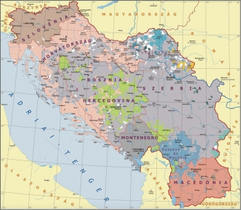 A délszláv háború (más néven jugoszláv polgárháború) első ciklusa szintén három szakaszra osztható: I. szlovéniai tíznapos háború (1991. június 26-tól július 7-ig), II. horvátországi háború (1991–95), III. boszniai háború (1992–95). A térképen a soknemzetiségű Jugoszlávia látható.2