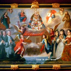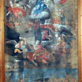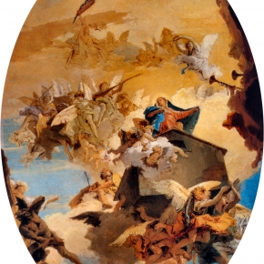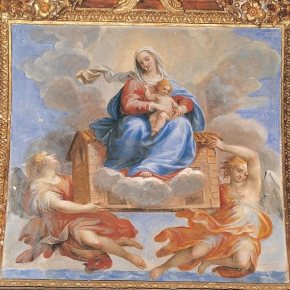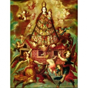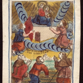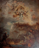 5. Mária háza a loretói kápolna részeként kegyszoborral látható. Nem táji környezetben jelenik meg ez a kép, hanem épületbelsőben. Előfordul, hogy felette apró jelenetben utalás történik a csodás angyali közreműködésre. A képen szentek, donátorok láthatók még.