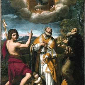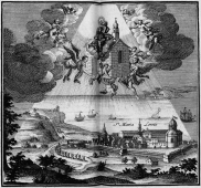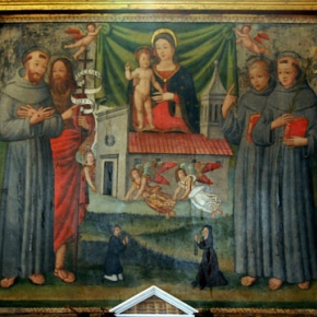 4. A szárazdöldön álló ház angyalok nélkül jelenik meg a tájban, a tetején ülő Madonna előtt donátorok térdelnek.