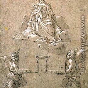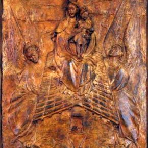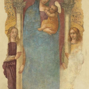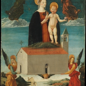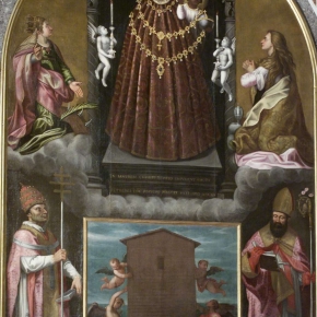 7. A Szent Ház szimbolikus ábrázolása tabernákulumként vagy baldachinként. “A loretói Madonna-ábrázolásnak ez a változata, amikor az angyalok tabernákulumot vagy baldachint tartanak az álló Mária fölé, viszonylag későn, a 14. század elején jelent meg az itáliai festészetben és hozzávetőlegesen csak egy évszázadig élt.” (Fehér Ildikó: Honnan érkezett Budapestre a Loretói Madonna, Artmagazin 2015/4. 44-47 o., M. Sensi: Santa Maria „liberatrice dalla peste”, in: Munus amicitiae: scritti per 70. genetliaco di Floriano Grimaldi. Szerk. G. Paci, M. L. Polichetti. Loreto, 2001, 361. o.)